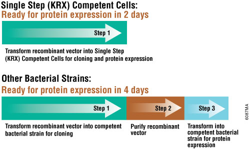 The Single Step (KRX) Competent Cells are designed for efficient transformation and tightly controlled protein expression. These cells consolidate the best attributes of these two steps into one strain to evaluate protein expression in E. coli. In two days, you can transform your vector into the Single Step (KRX) Competent Cells and be ready for protein expression. Transformation efficiencies are greater than 108 cfu/μg, similar to other highly competent cells. The single step cells are available in single transformation size (50μl). KRX also can be used for blue/white screening. Single Step (KRX) is an E. coli K strain that contains a chromosomal copy of the T7 RNA polymerase driven by a rhamnose promoter (rhaBAD) to provide dramatic control of the proteins expressed via a T7 promoter. Pre-induced expression protein levels are significantly lower than those of BL21(DE3)-derived strains. This feature facilitates cloning and expression of proteins toxic to E. coli.
